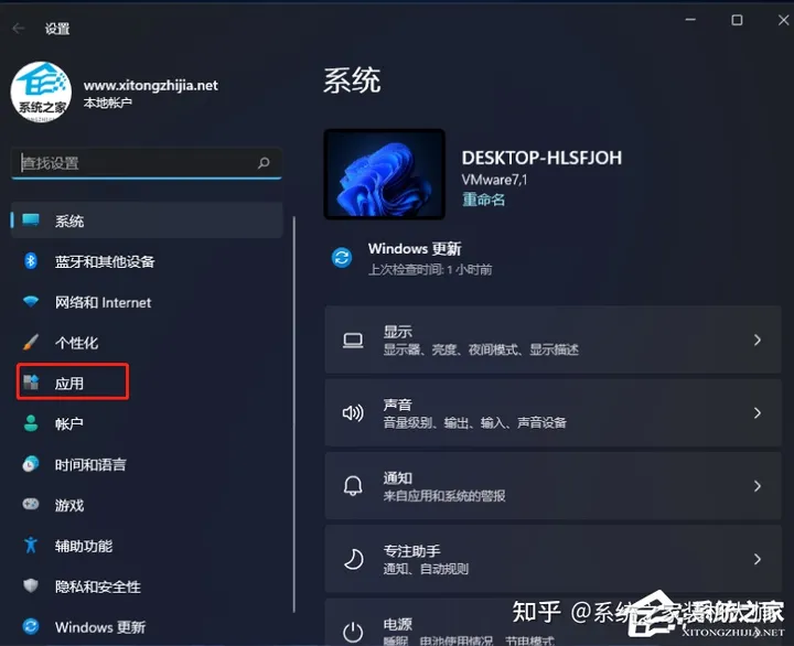 设置窗口,左侧边栏,点击应用;
